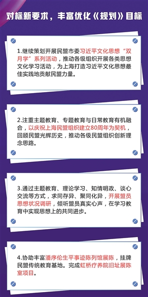 在《规划》编制以外,民盟市委也根据新形势,对标新要求,重点围绕七个方面持续发力,不断丰富优化《规划》目标。2023年10月,全国宣传思想文化工作会议正式提出并系统阐释了习近平文化思想。2024年初,为响应上海提出建设习近平文化思想最佳实践地的要求,民盟市委正式以学习贯彻习近平文化思想为主线,开展“双月学”系列活动。“以前学理论觉得抽象,现在跟着‘双月学’走,越学越有方向。”这是基层盟员的普遍感受。近两年来,在民盟市委的指导支持下,各级基层组织开展200余项文化学习活动,涵盖学术交流、话剧演出、展陈展览、知识竞赛等活动,构建了理论与实践交融的沉浸式、体验式文化课堂。未来两年,民盟市委将继续策划开展“双月学”系列活动,以庆祝上海民盟组织建立80周年为契机,推动各级组织开展各类思想文化学习活动,为上海打造习近平文化思想最佳实践地贡献民盟力量。