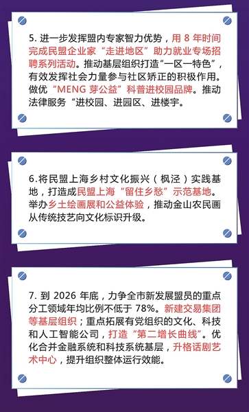 2023年,市委统战部提出“融入国家重大战略任务、融入区域经济社会发展”工作要求。民盟市委积极响应并立足界别特色和工作实际主动与市教卫工作党委、市司法局、市文化旅游局和中共金山、普陀、嘉定、杨浦区委签约共建。通过建立并深化“党政提出课题,民盟组织研究”工作机制,围绕“上海古文化廊道”“优化高等教育和职业教育布局”等主题进行研究,相关成果转化成市两会集体提案,引起媒体广泛关注。与此同时,民盟市委创新推出民盟企业家“走进地区”助力就业专场招聘活动,依托盟内企业资源优势,累计为求职者提供岗位超7000个,成为上海民盟服务区域民生、赋能经济社会发展的特色实践。未来,民盟市委还将持续发挥盟内专家智力与企业资源双重优势,为上海区域发展贡献更多民盟力量。